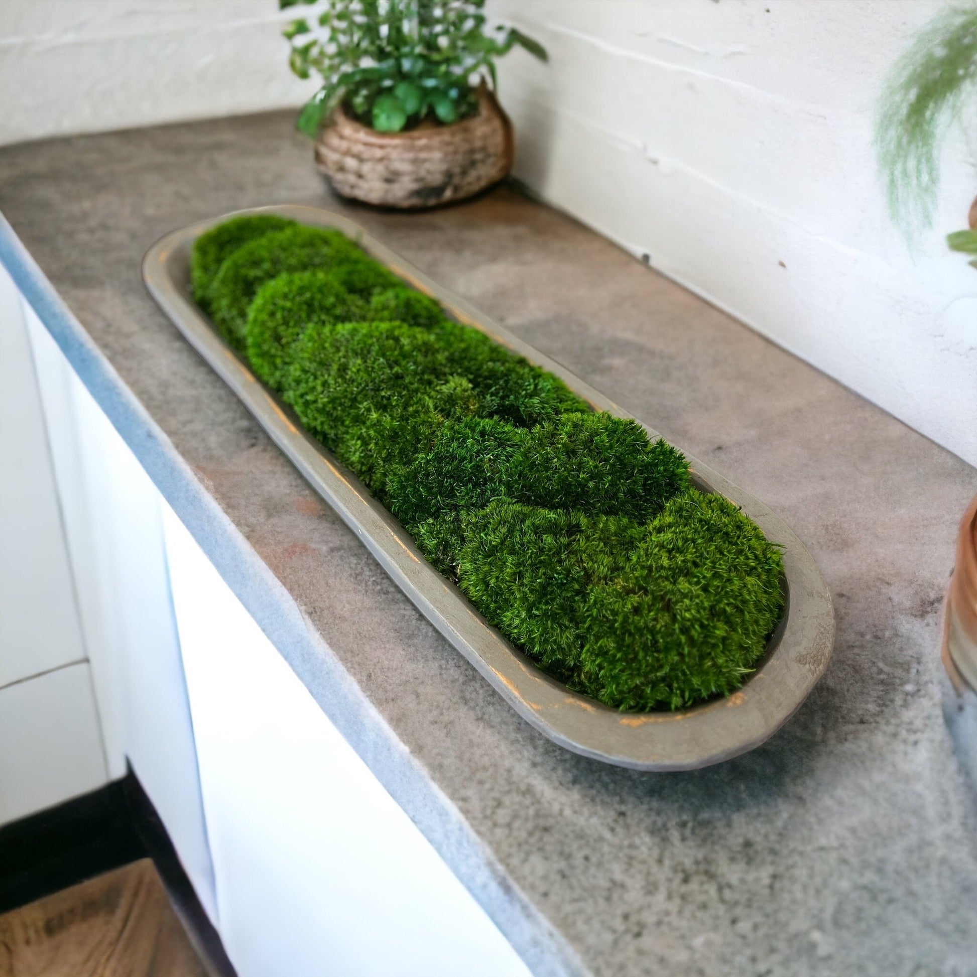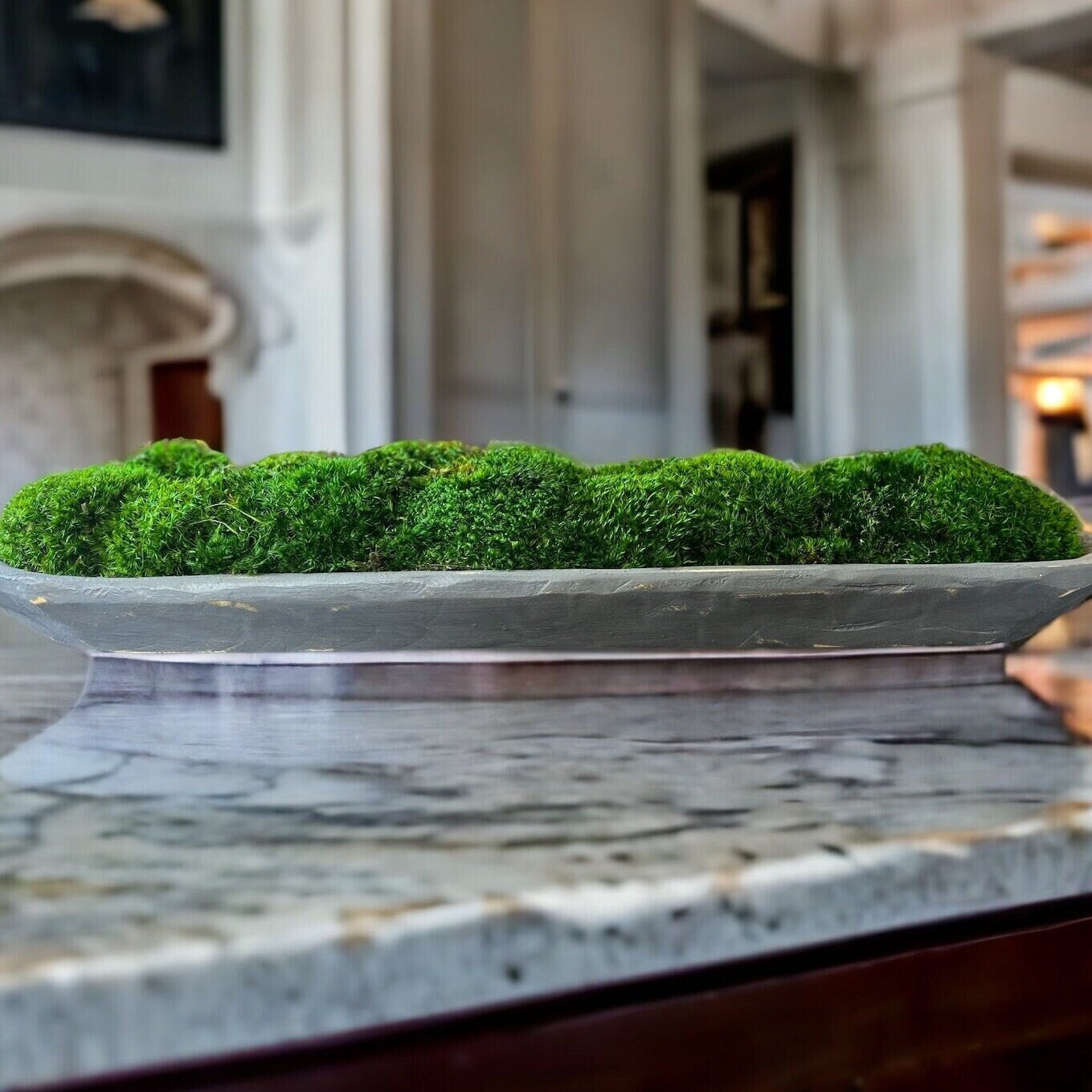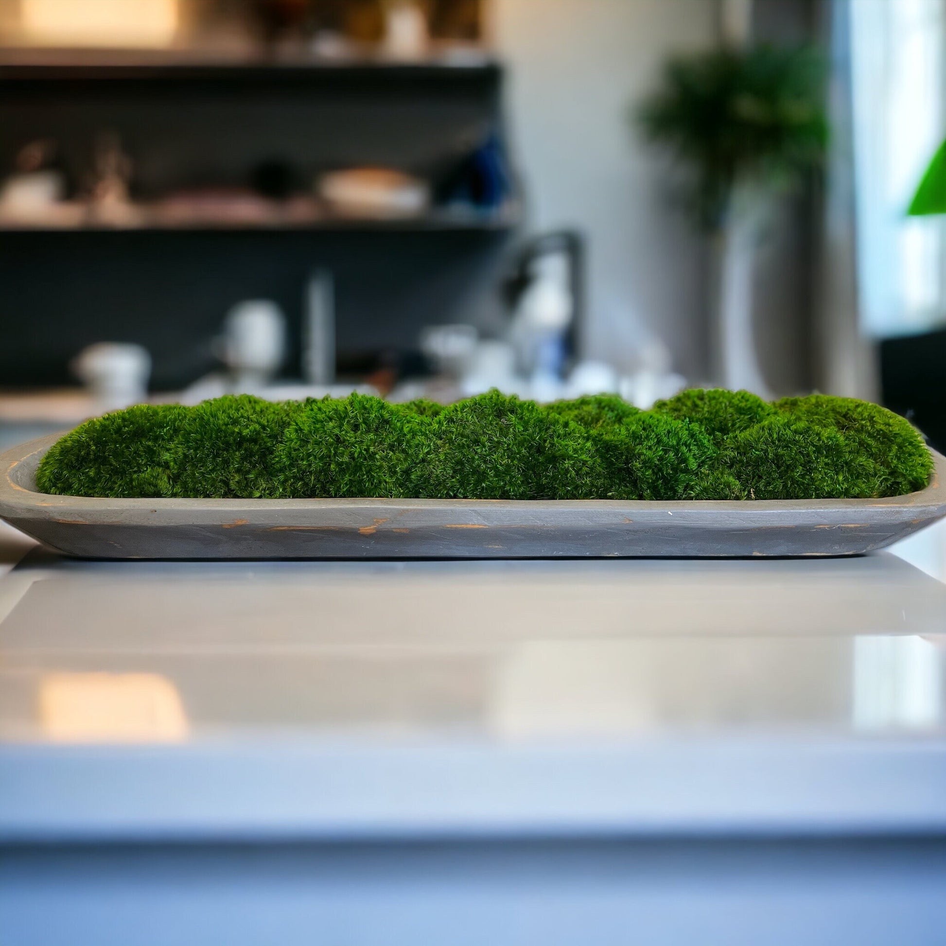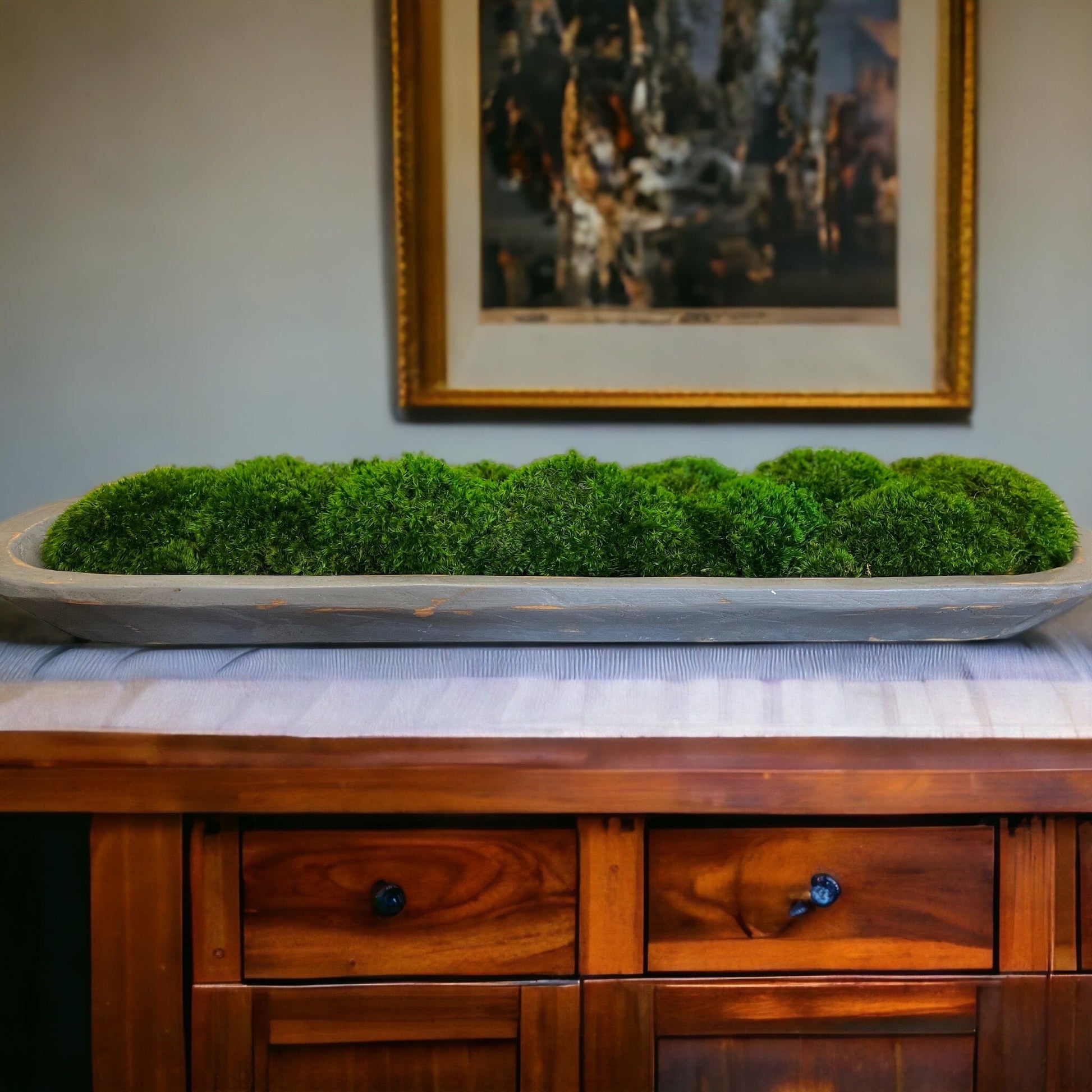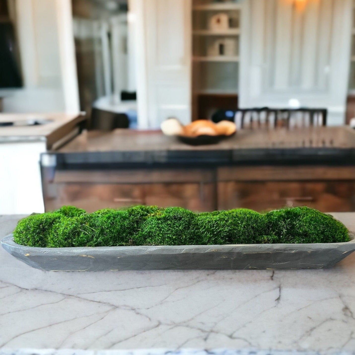 76,2 x 23,9 x 6,3 cm große, konservierte moosgraue Teigschüssel. Stimmungsvolles Moos in einer rustikalen grauen Holzteigschüssel. Dies ist eine große rustikale Holzschüssel. Einer unserer Bestseller. Ein tolles Kunden- oder Einweihungsgeschenk. Perfektes Herzstück für Büro- oder Esstisch.