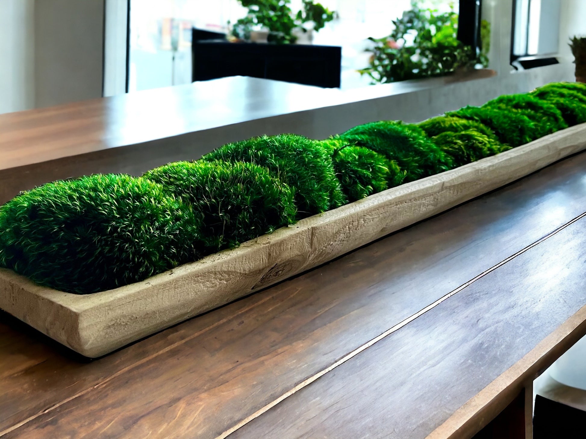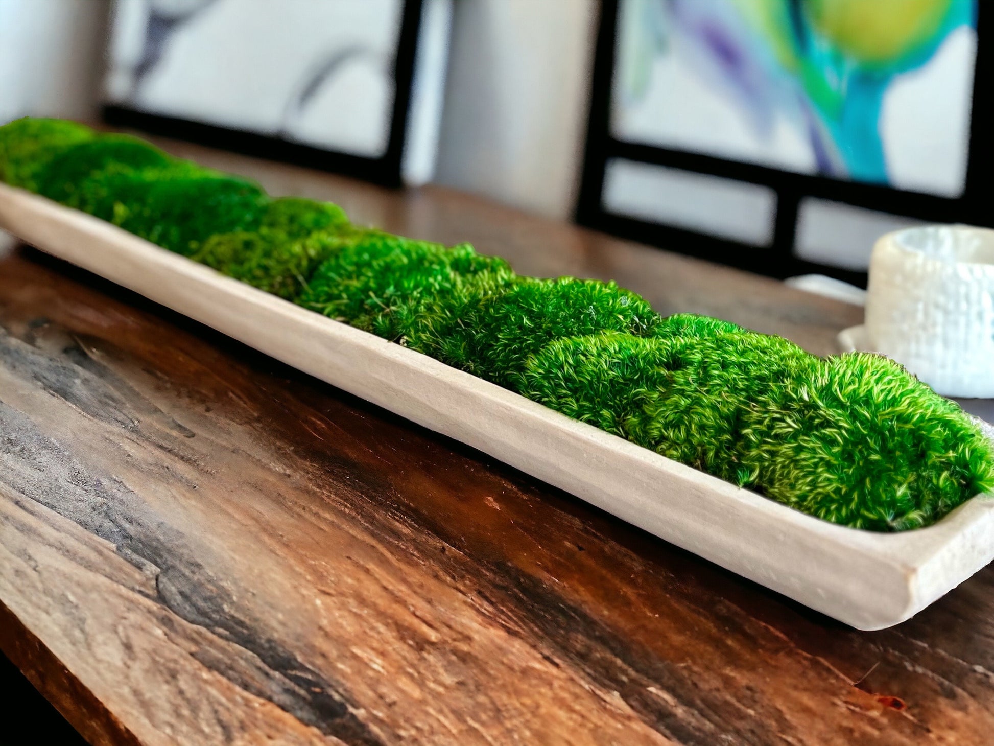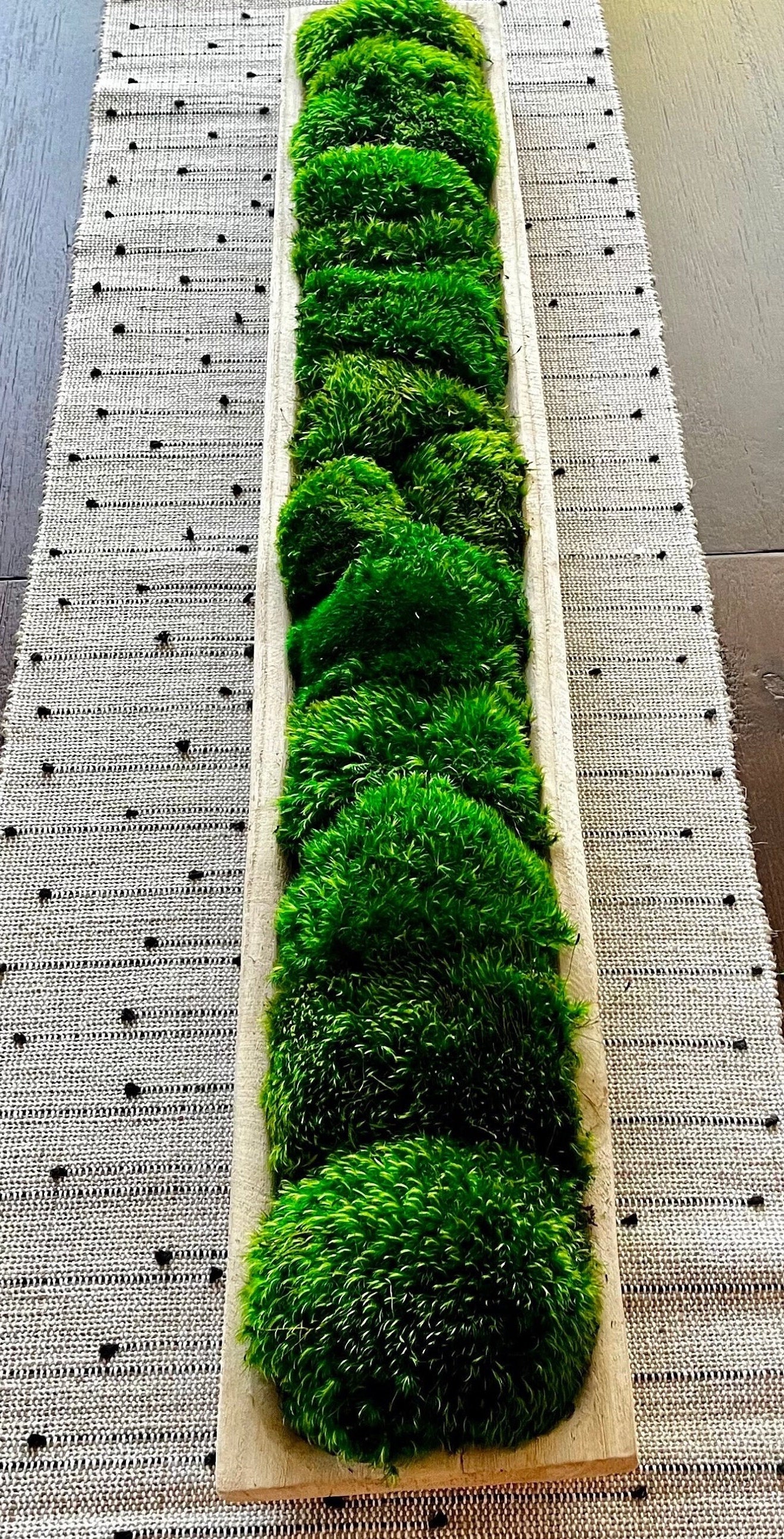40 Zoll extralange Moosschale als Tafelaufsatz für Ihren Tisch, ein umweltfreundlicher Tafelaufsatz, der Ihrem Esszimmer eine einzigartige Note verleiht. Diese Tischdekoration aus konserviertem Moos ist ein einzigartiges Geschenk für jede Tischdekoration zu Hause.