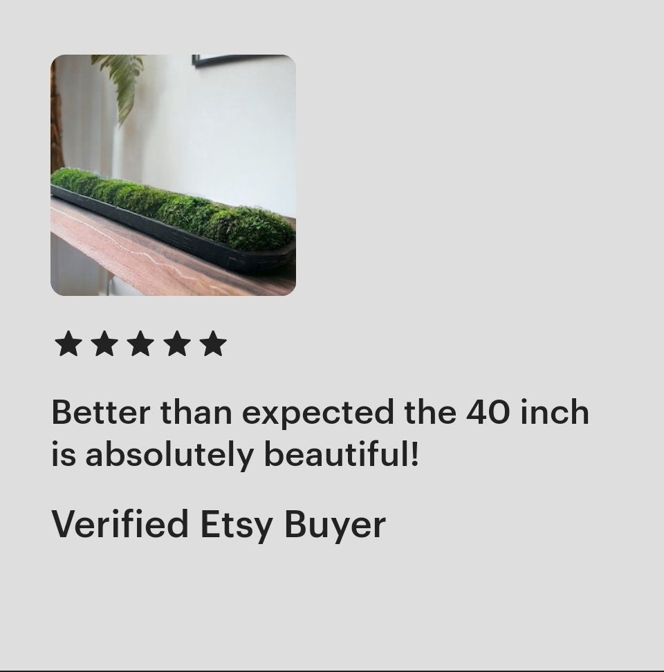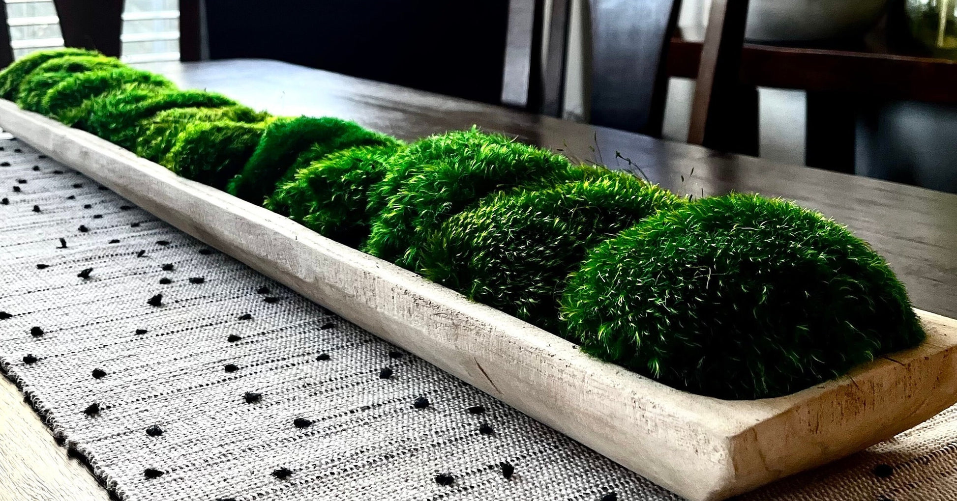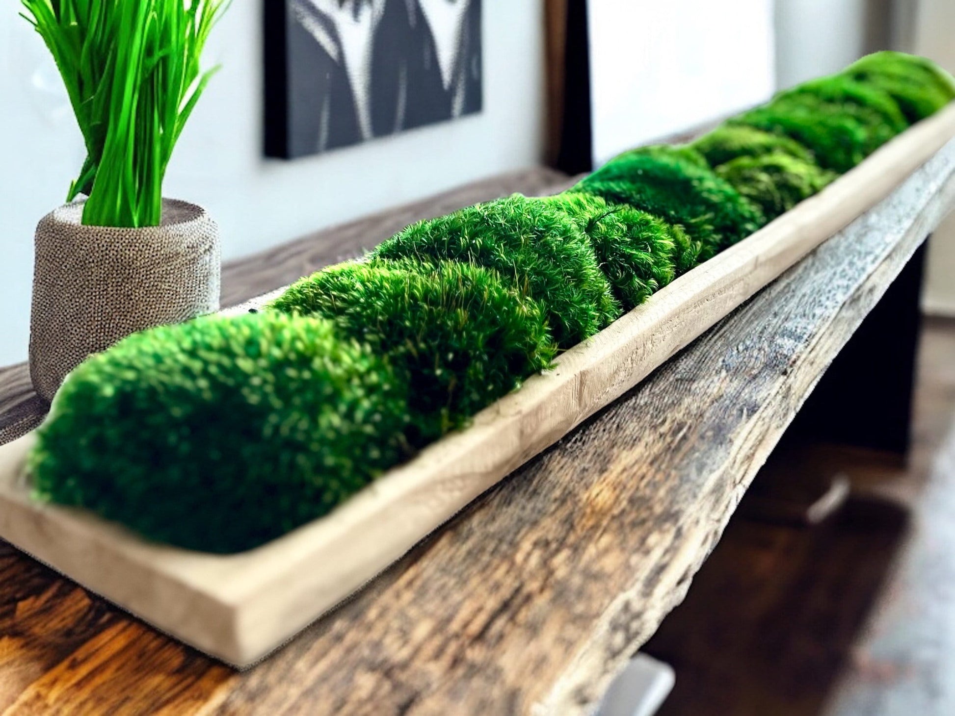 40 Zoll extralange Moosschale als Tafelaufsatz für Ihren Tisch, ein umweltfreundlicher Tafelaufsatz, der Ihrem Esszimmer eine einzigartige Note verleiht. Diese Tischdekoration aus konserviertem Moos ist ein einzigartiges Geschenk für jede Tischdekoration zu Hause.