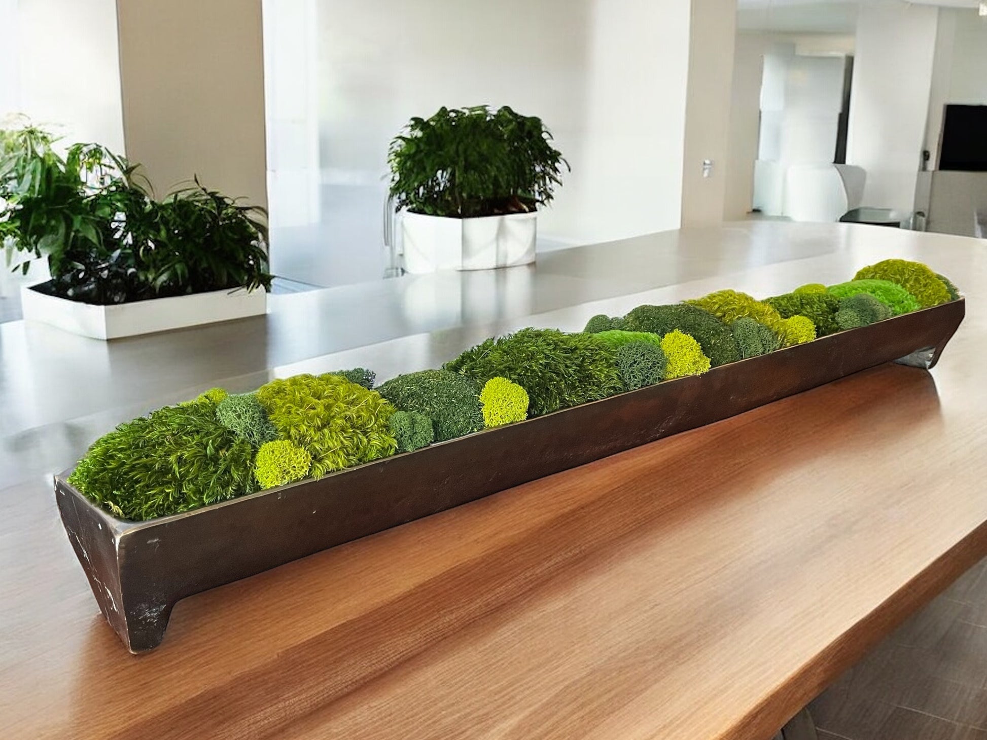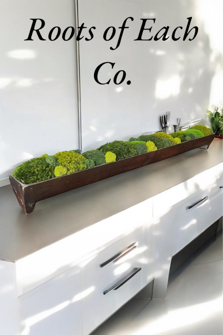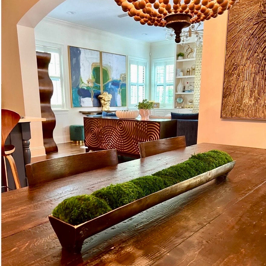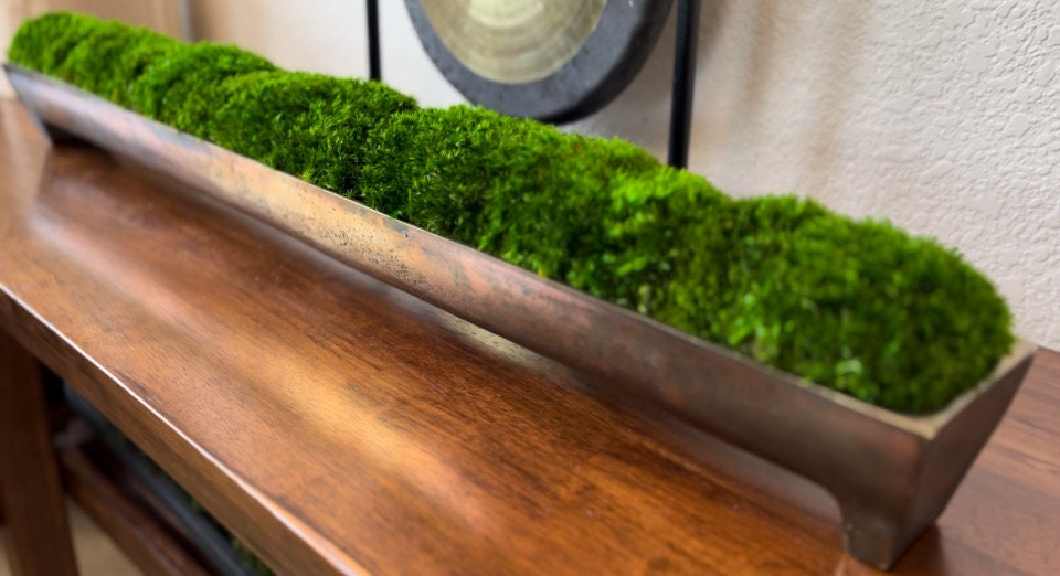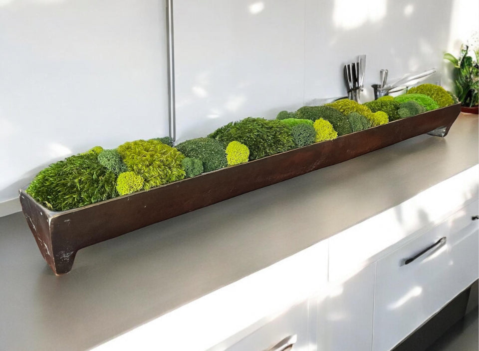 Das Moos-Mittelstück für Ihre Inszenierung und Wohndekoration ist ein Tischgeschenk aus konserviertem Moos, elegant arrangiert in einem Aluminiumtrog aus Bronze mit Kanalpatina. Dieses einzigartige Stück dient als perfekte Alternative zur Teigschüssel und wertet Restaurierungsdekore wunderschön auf.