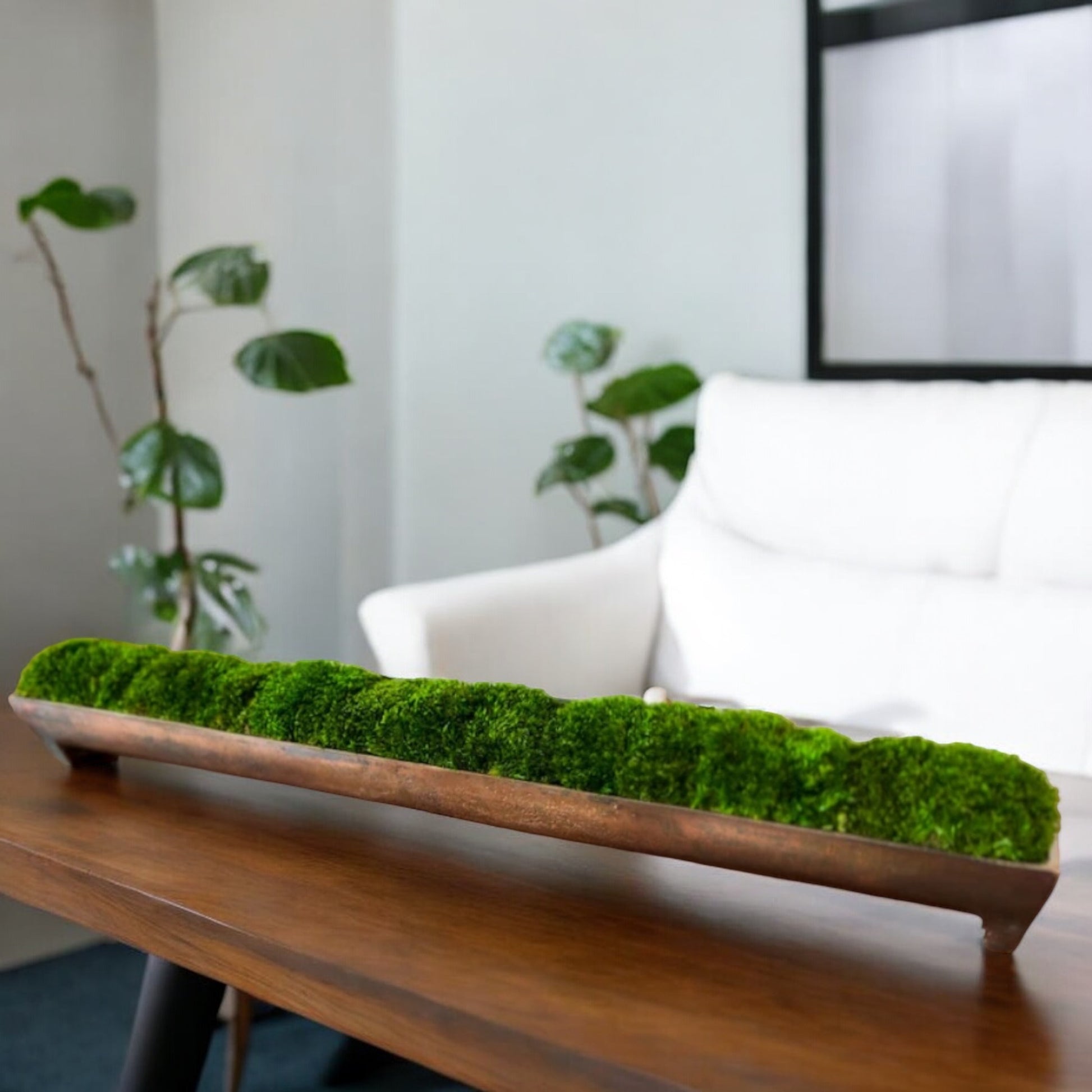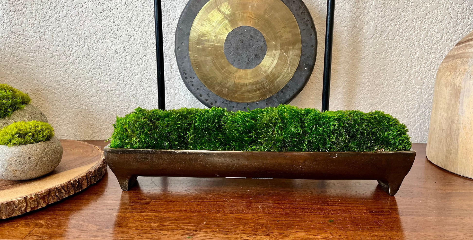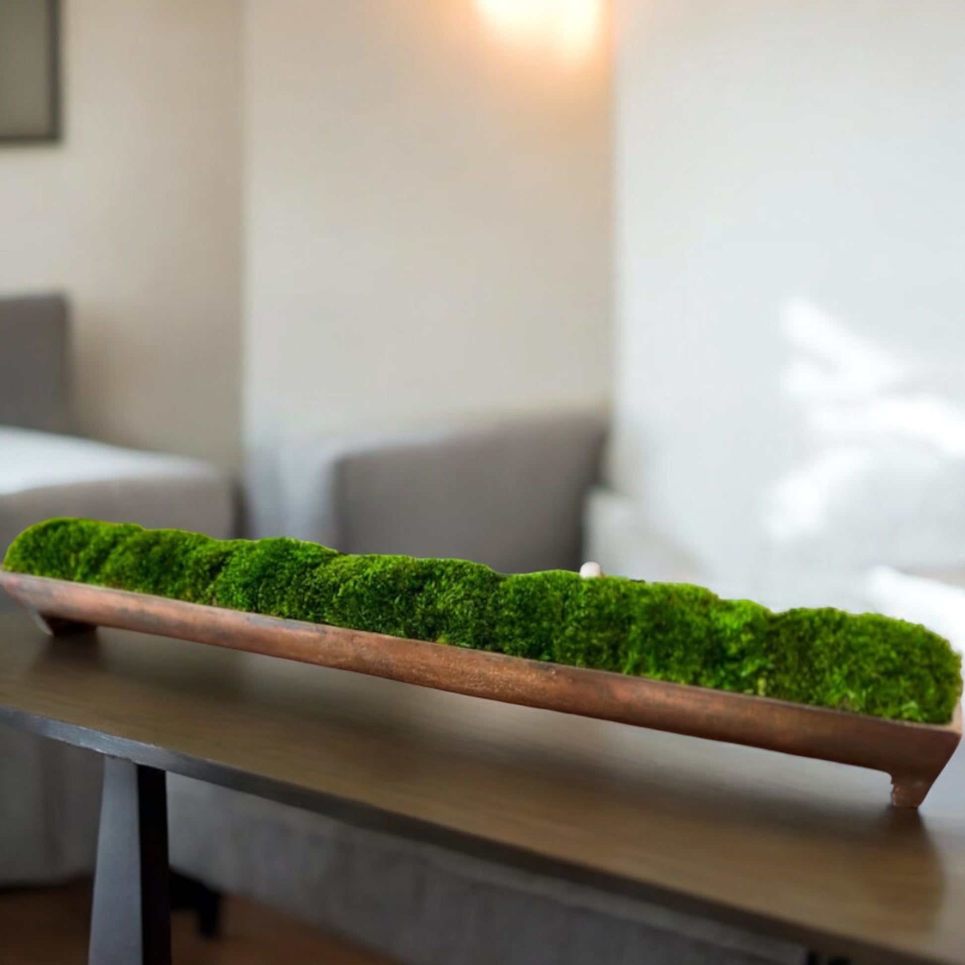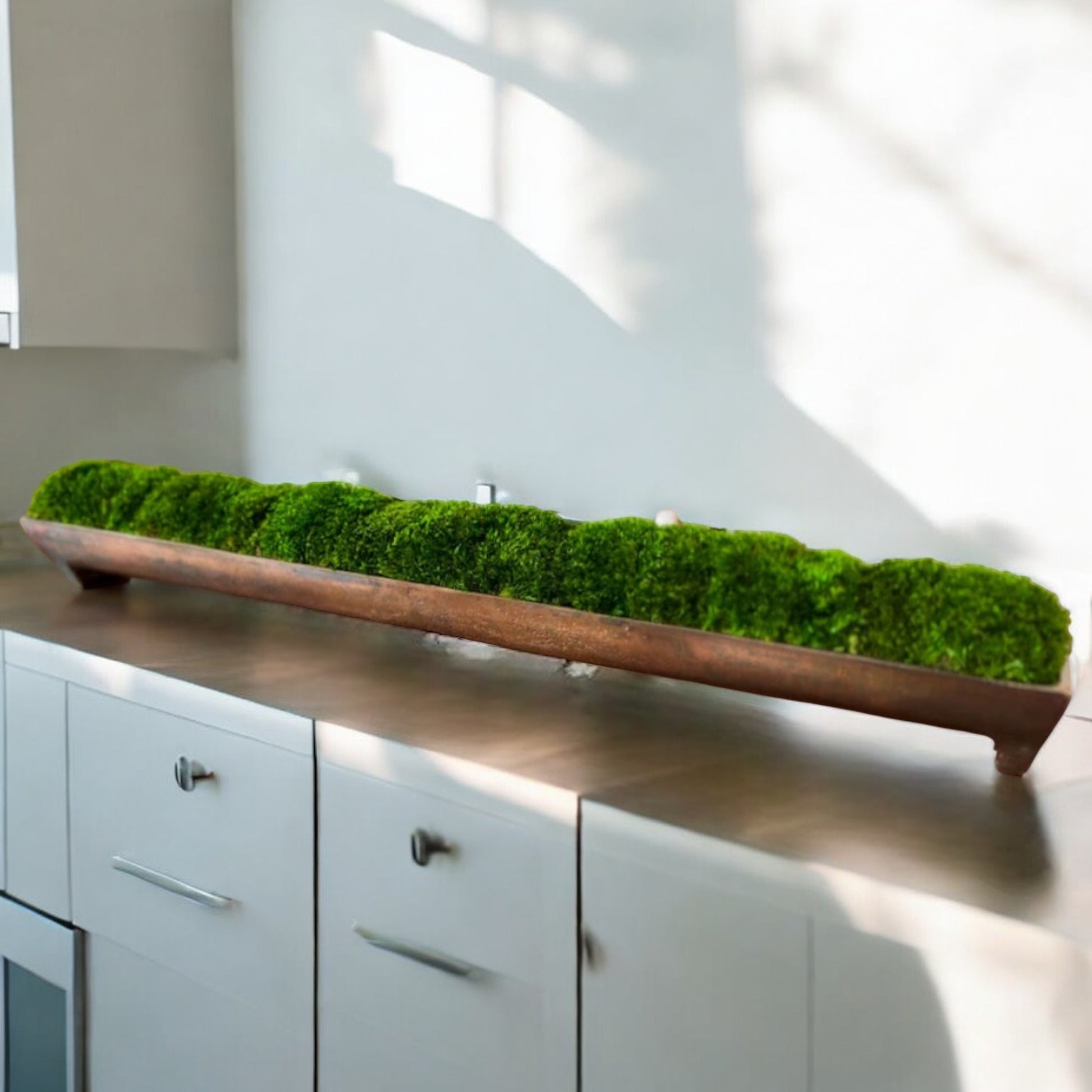 Das Moos-Mittelstück für Ihre Inszenierung und Wohndekoration ist ein Tischgeschenk aus konserviertem Moos, elegant arrangiert in einem Aluminiumtrog aus Bronze mit Kanalpatina. Dieses einzigartige Stück dient als perfekte Alternative zur Teigschüssel und wertet Restaurierungsdekore wunderschön auf.