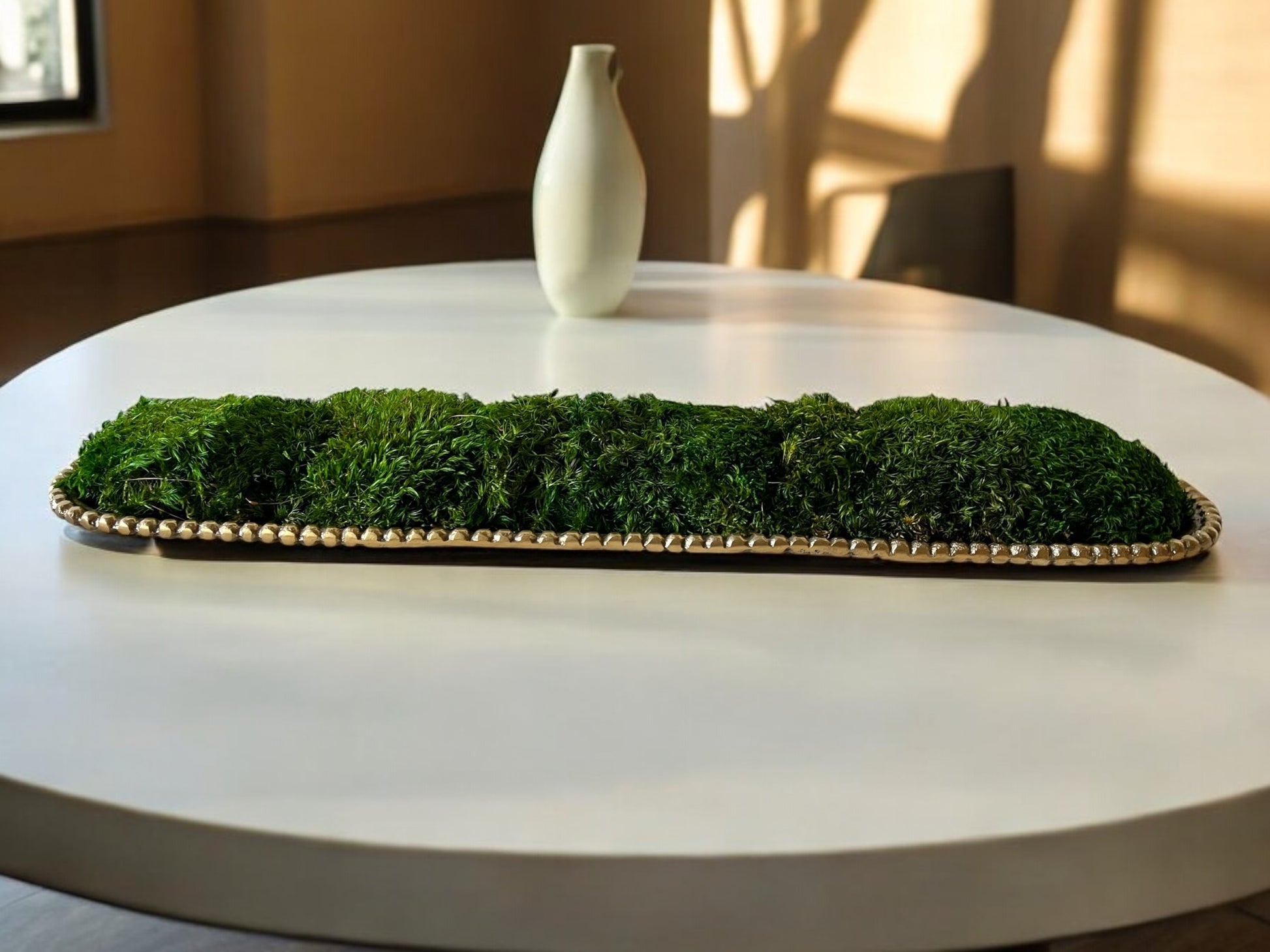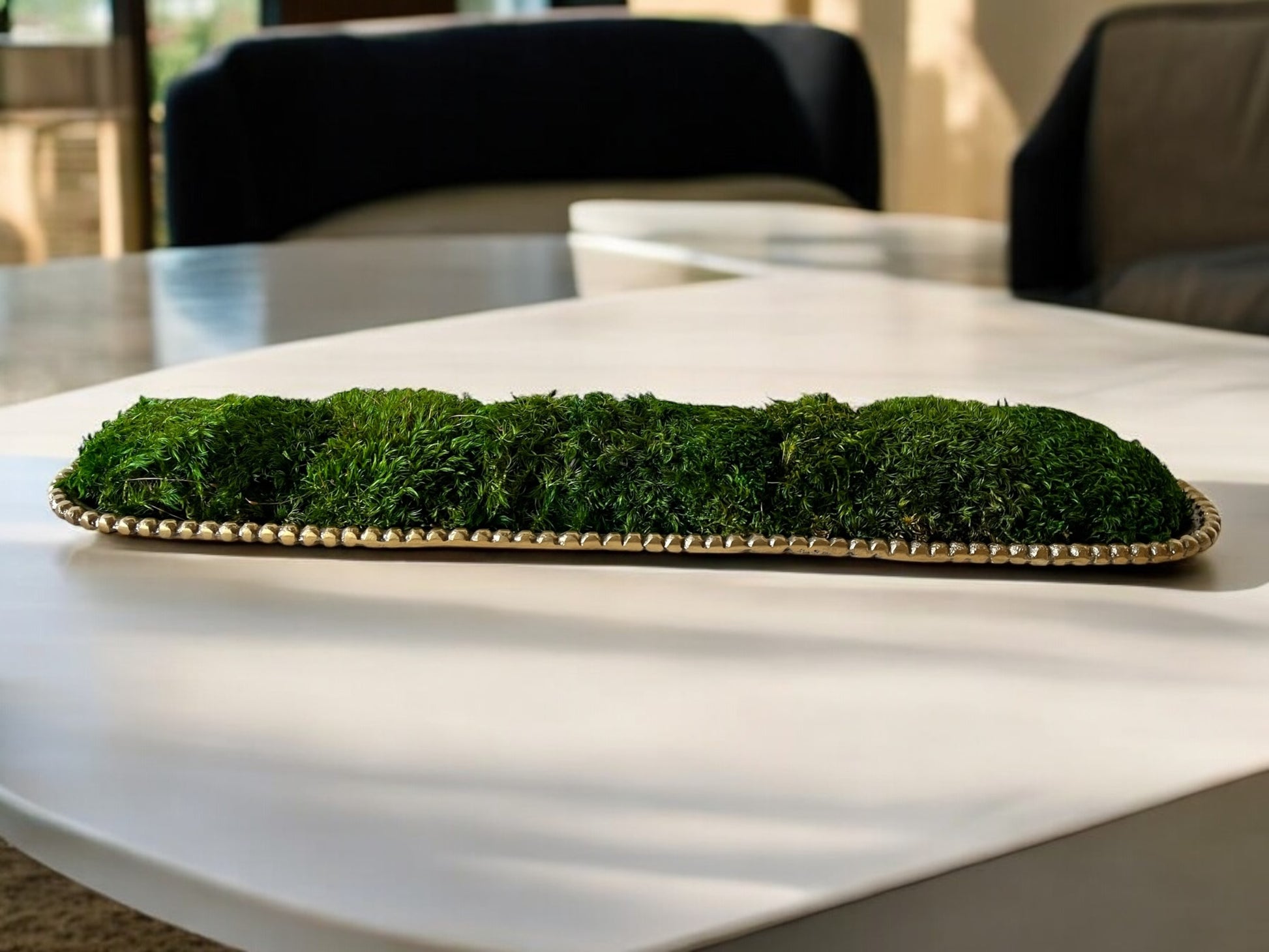 This preserved moss centerpiece makes for modern table decor and natural home decor, perfect as a metal tray display. This eco-friendly botanical gift is ideal for wedding event decor and brings a touch of indoor green decor to any space.