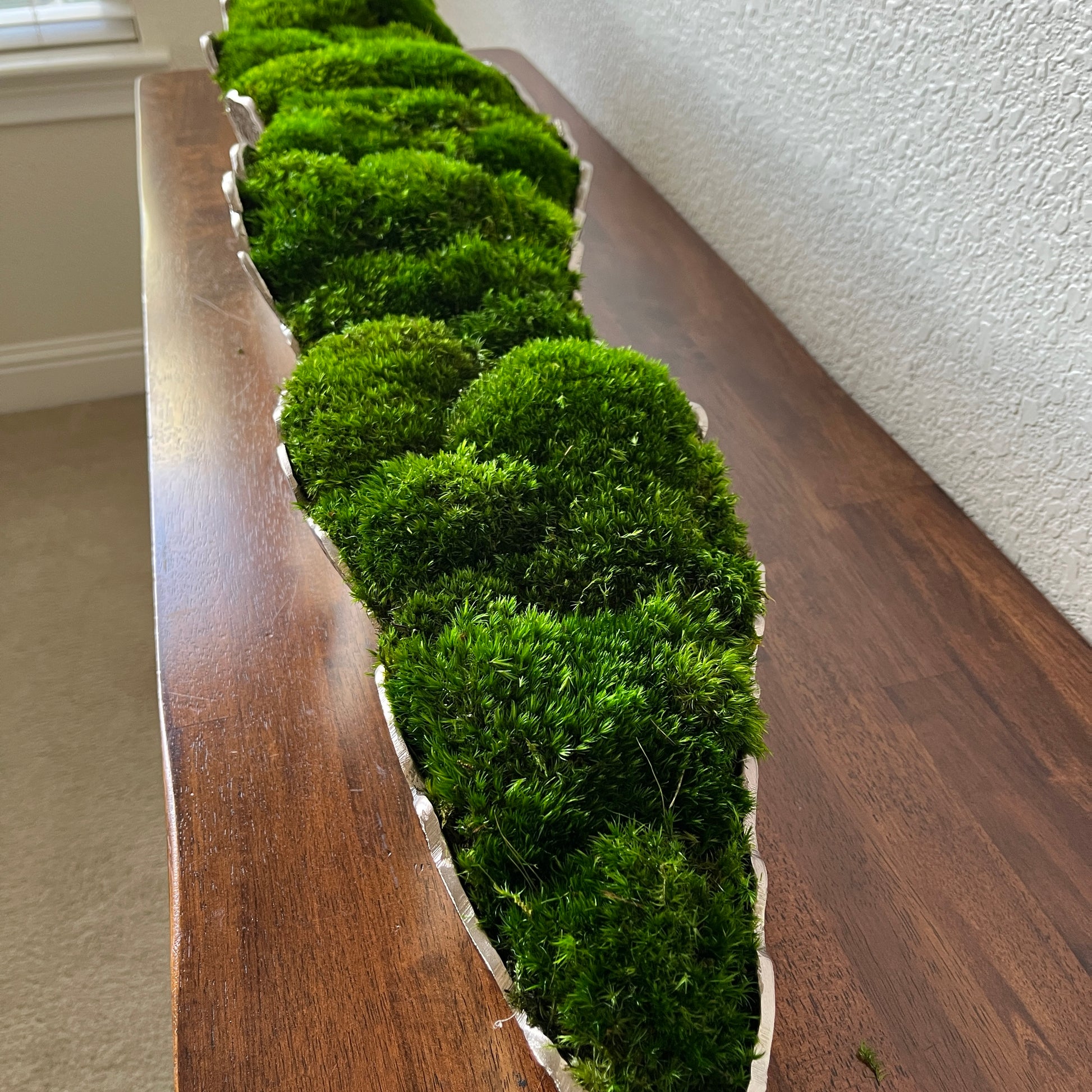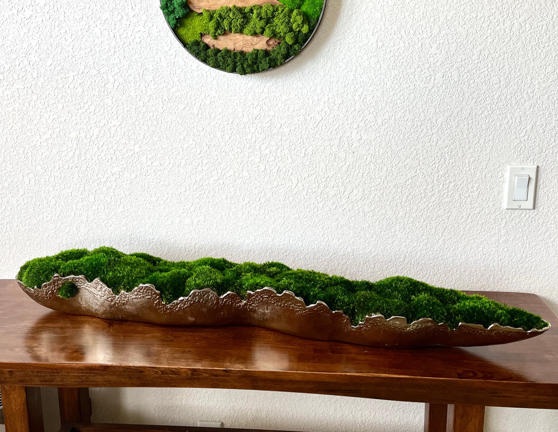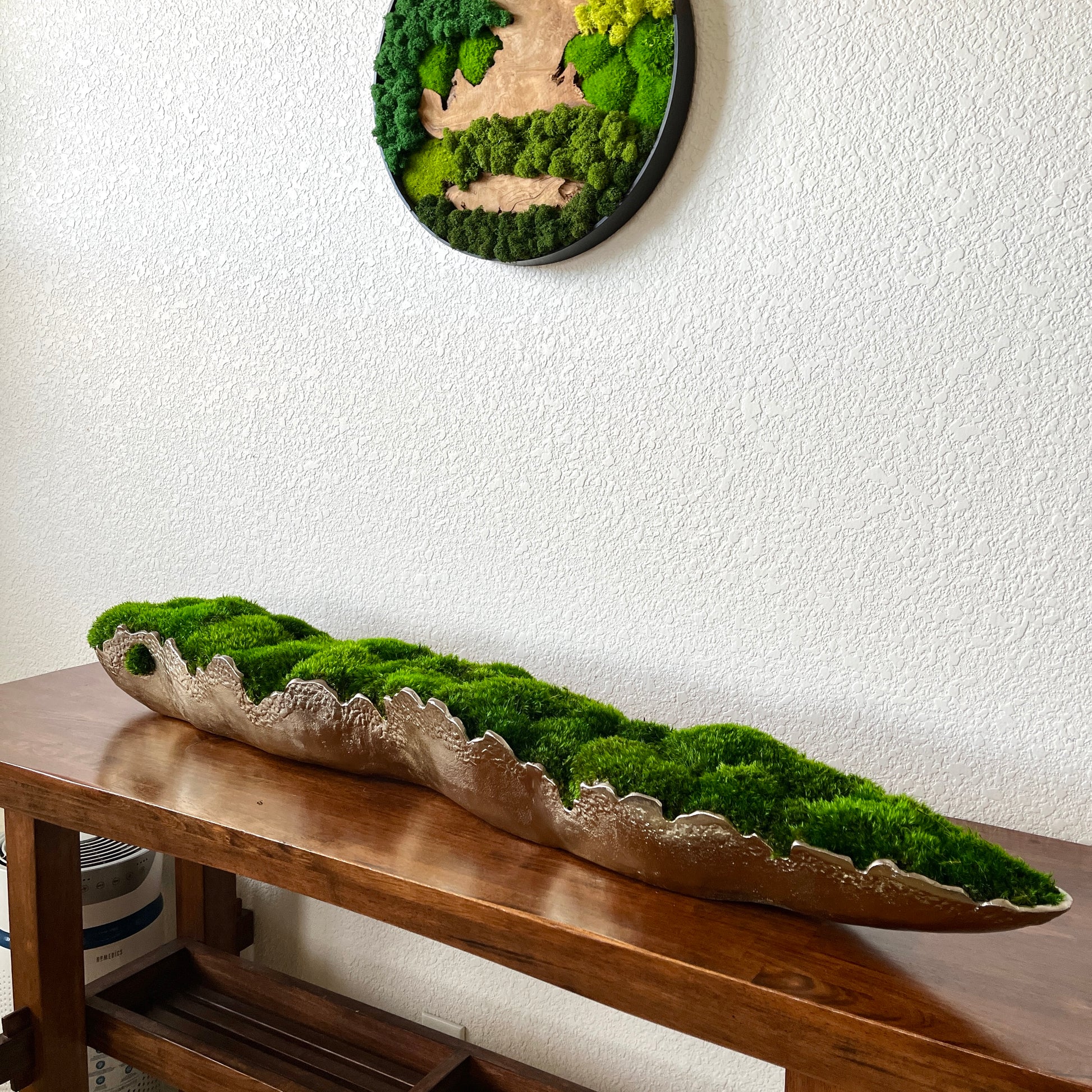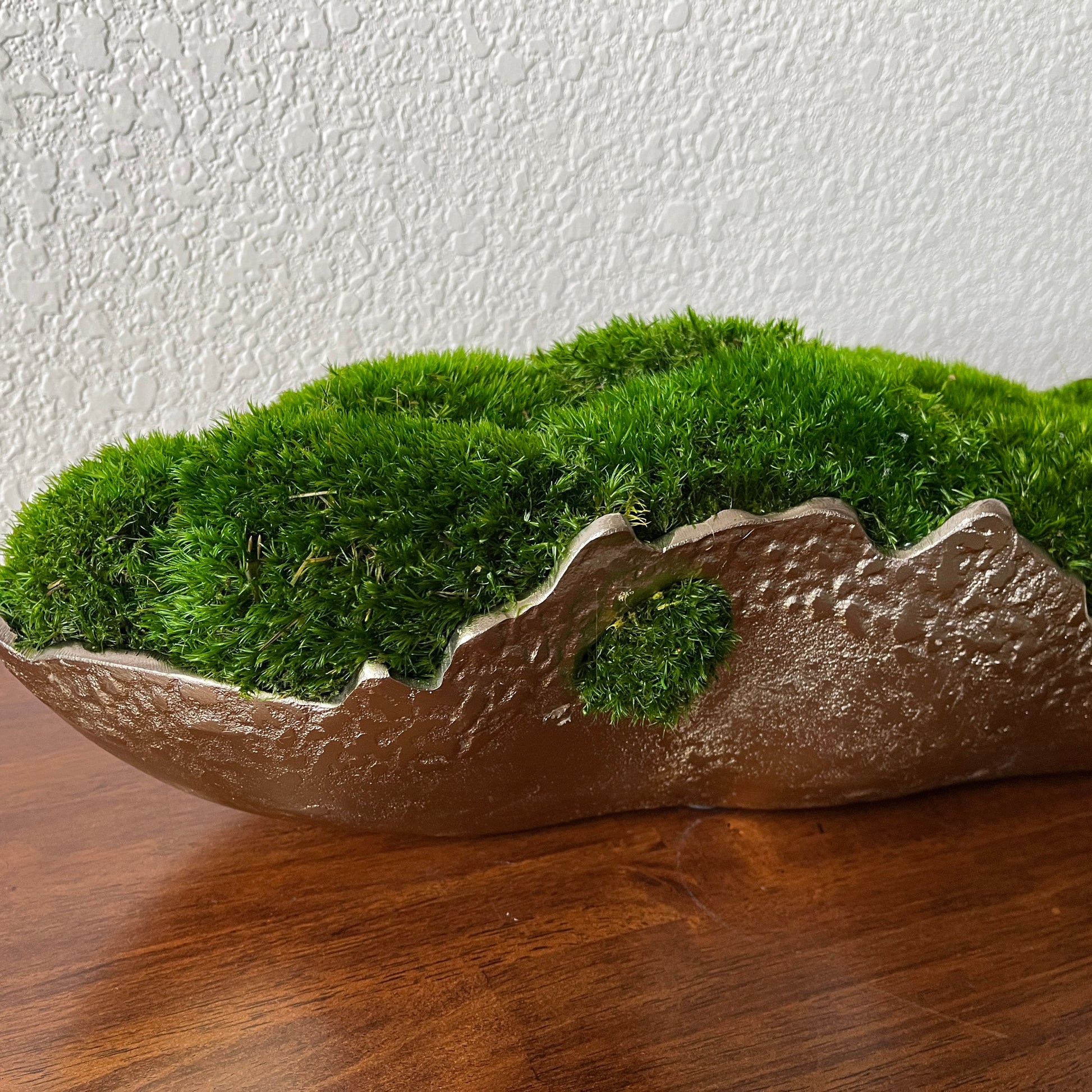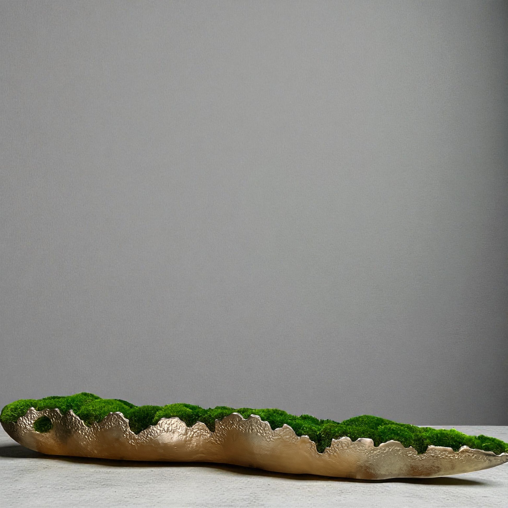 Discover the perfect marriage of artistry and practicality with this handcrafted preserved moss arrangement. Each piece is carefully composed within a refined gold or silver metallic aluminum vessel, available in two substantial sizes to complement any space. Unlike living plants, this arrangement requires zero maintenance—no watering, no seasonal care—while maintaining its natural aesthetic indefinitely. The preserved moss thrives in stable indoor environments with indirect light; simply protect it from direct sunlight, excess moisture, and high humidity. Maintenance is minimal: a gentle pass with a cool-setting blow dryer or soft brush keeps it looking gallery-fresh. Weighing approximately 10 lbs, this sophisticated tabletop display transforms dining tables, coffee tables, mantles, and offices into curated spaces that celebrate natural elements without demanding ongoing attention.
