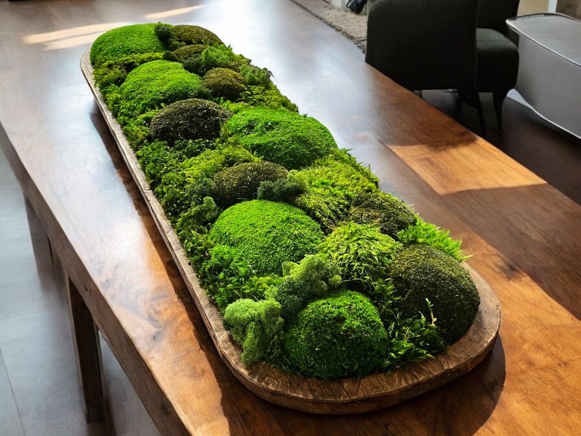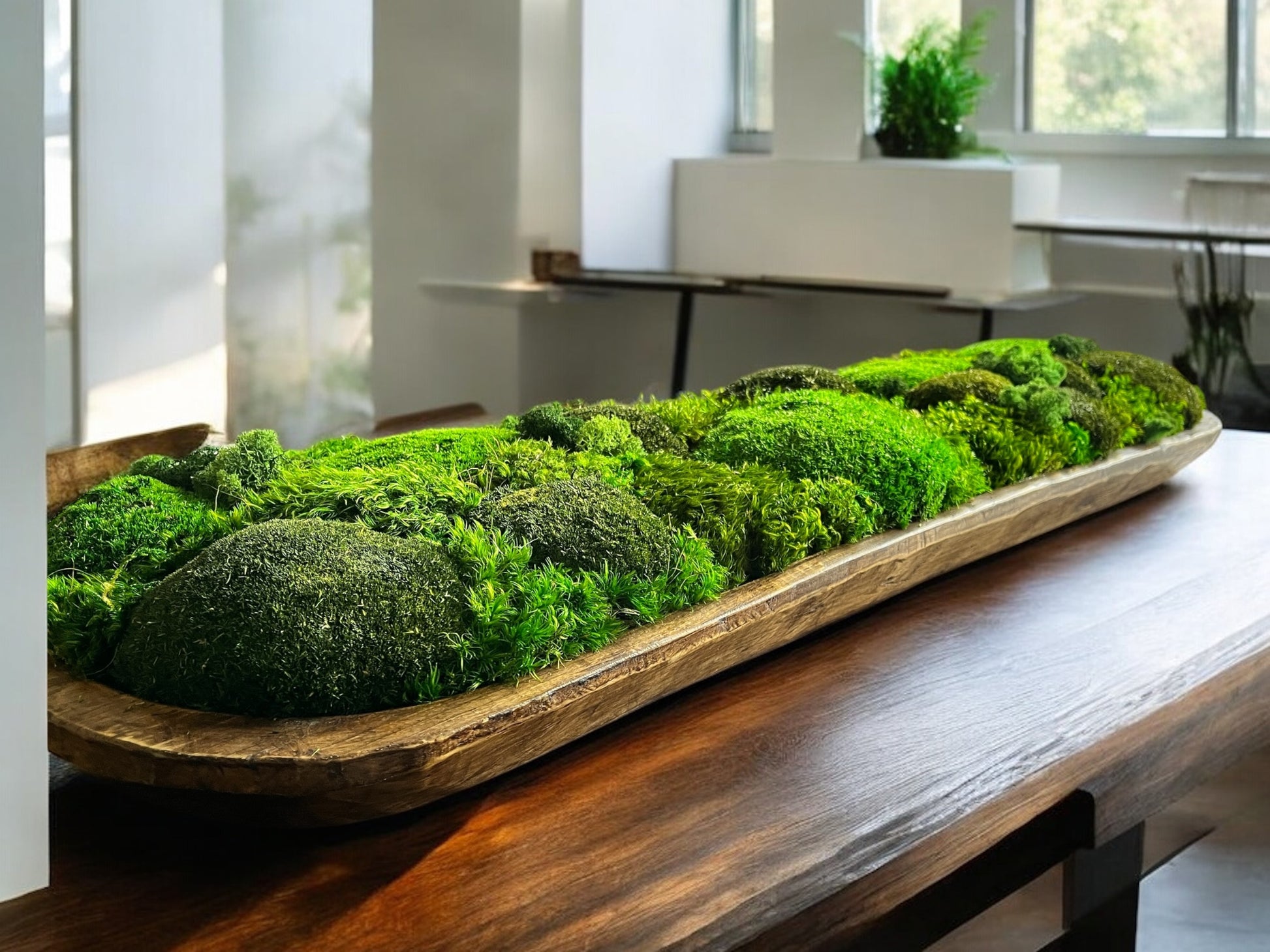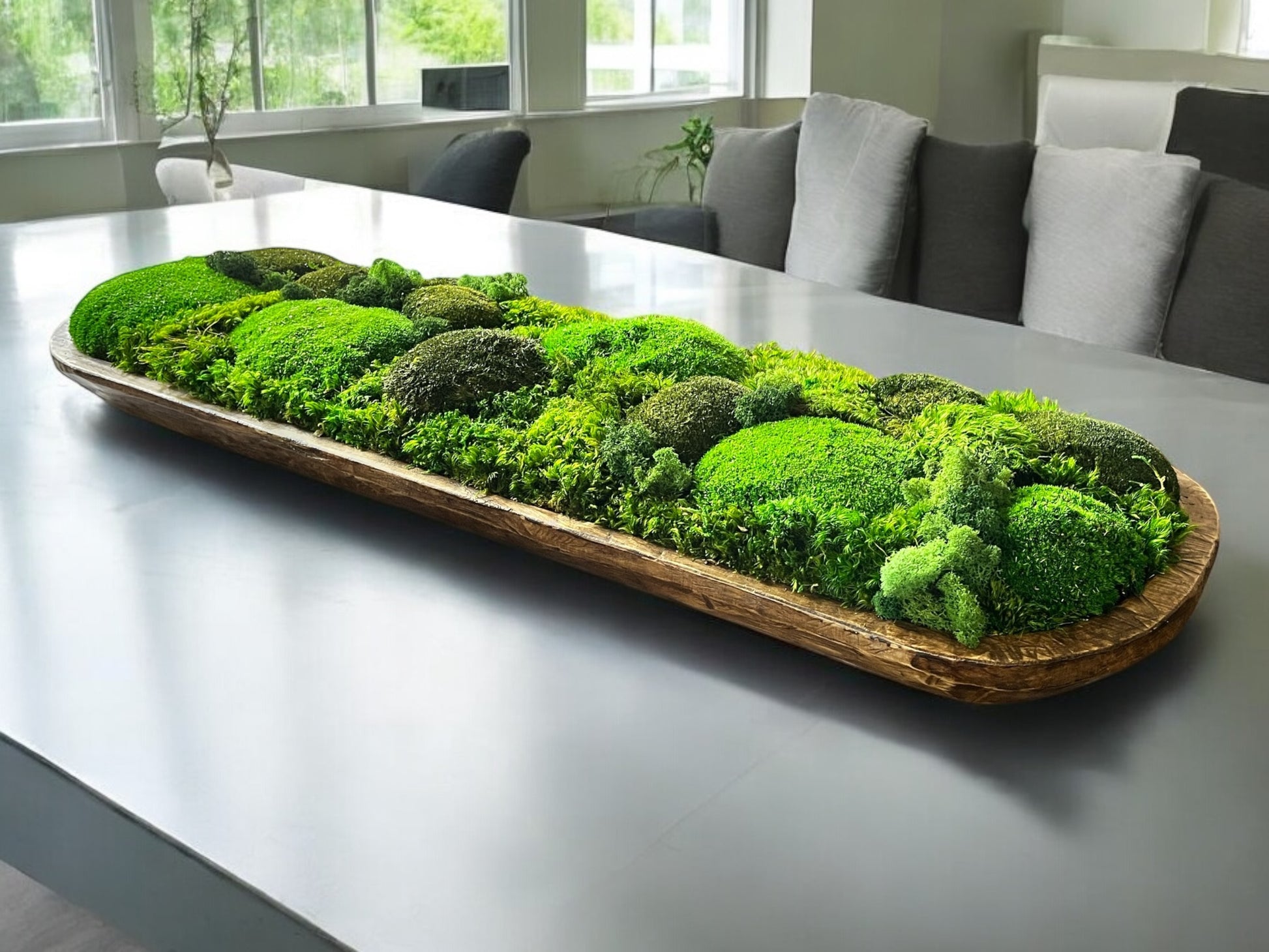 FAITES ENTRÉ L'EXTÉRIEUR : CENTRE DE TABLE EXTRA LARGE EN MOUSSE PRÉSERVÉE DANS UN BOL À PÂTE RUSTIQUE