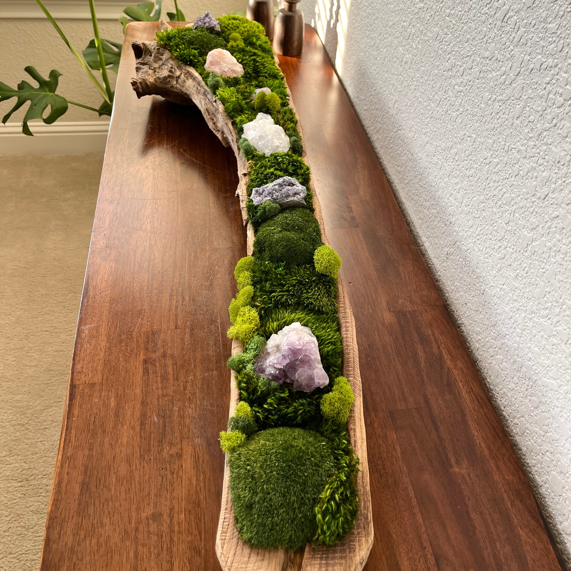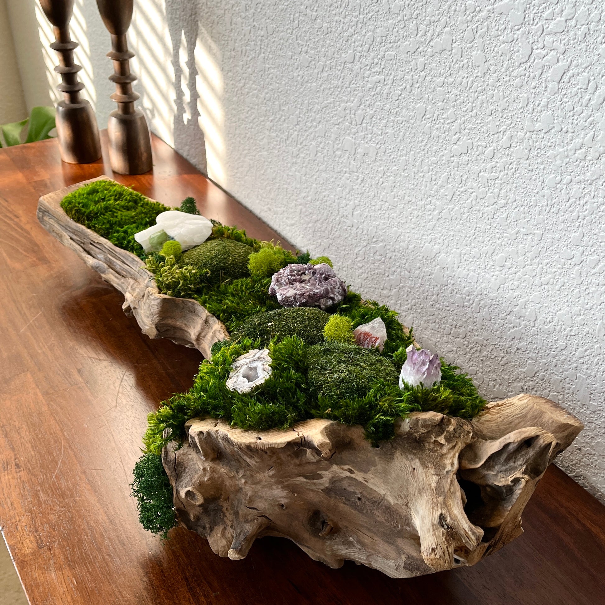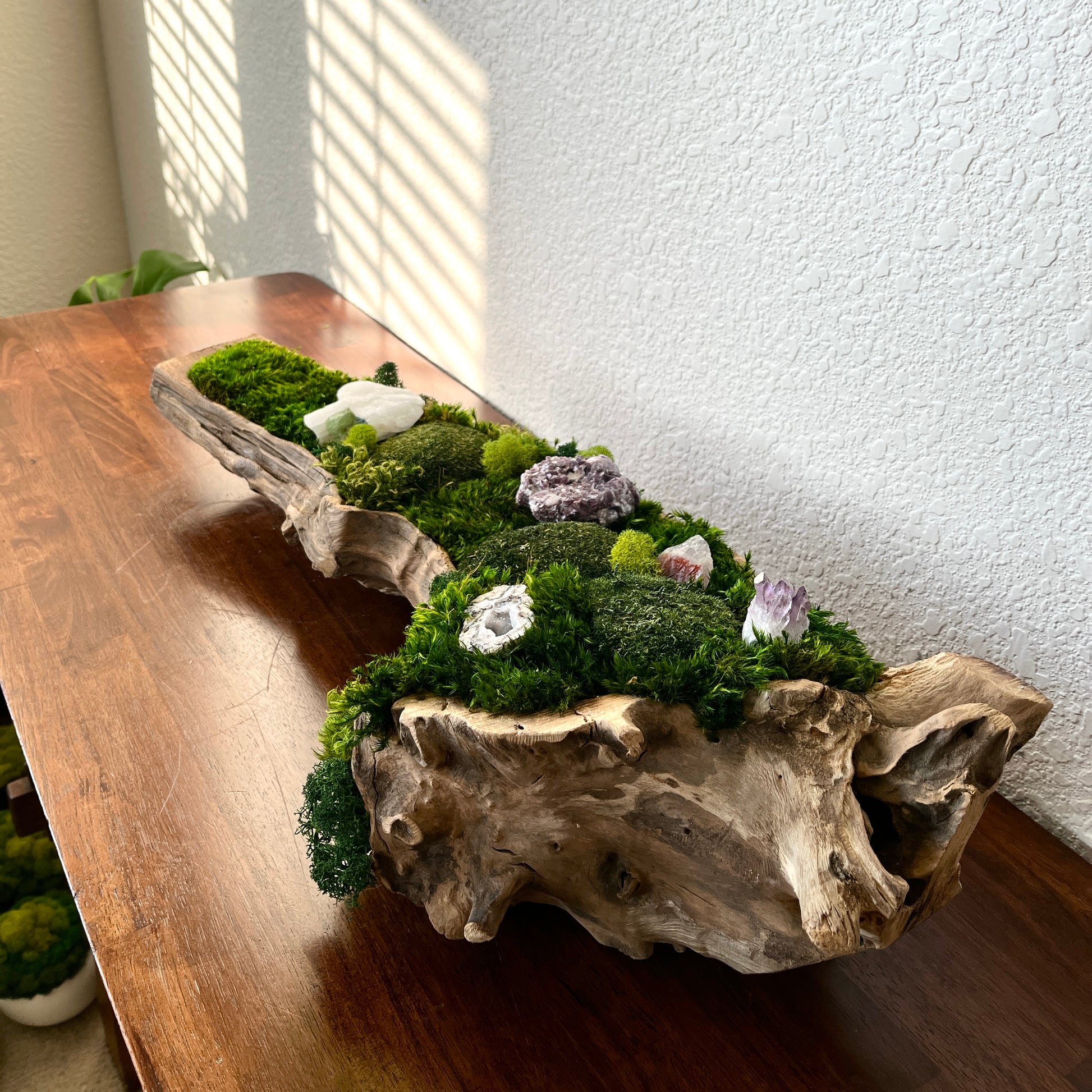 - Handcrafted centerpiece featuring preserved moss, driftwood, and your choice of crystals
