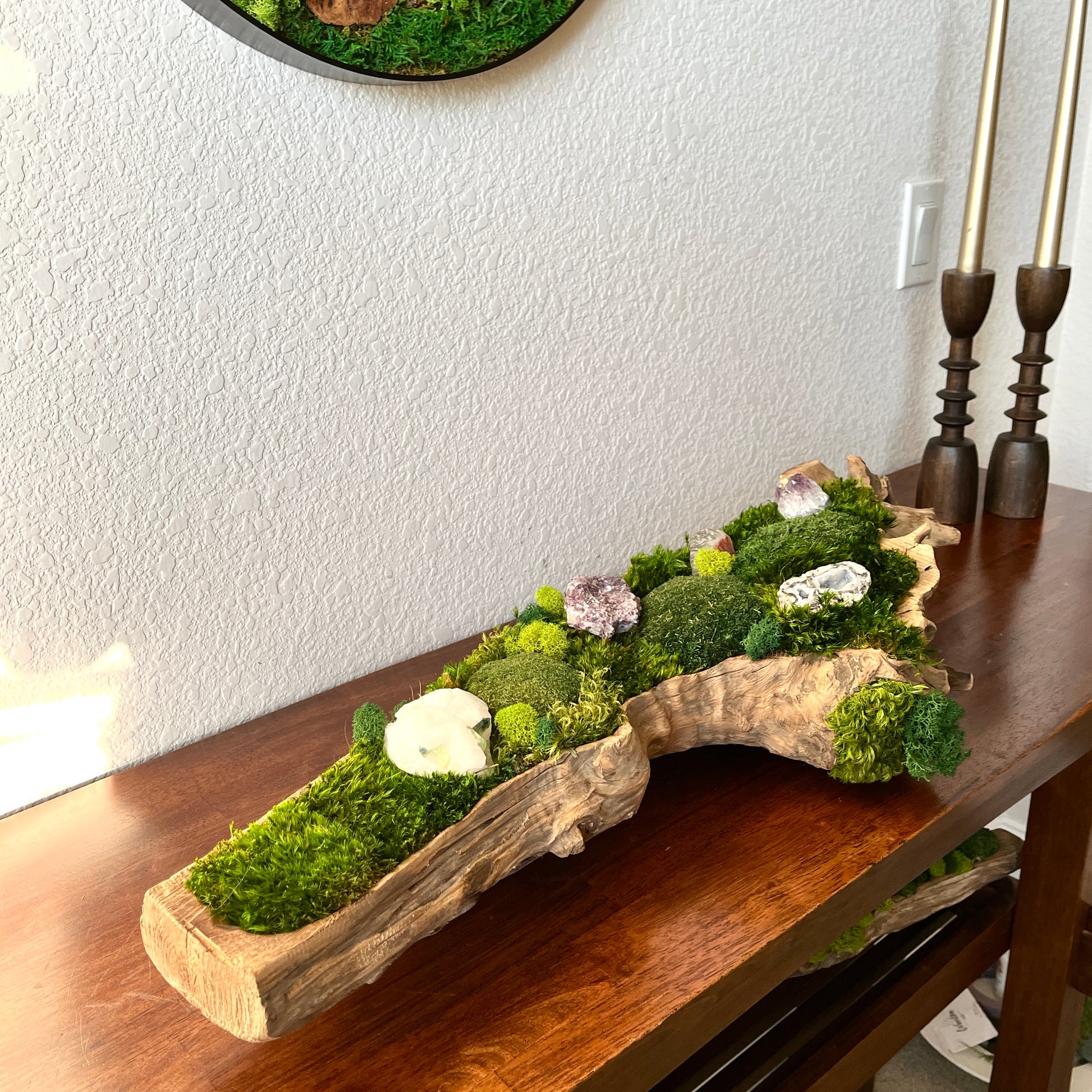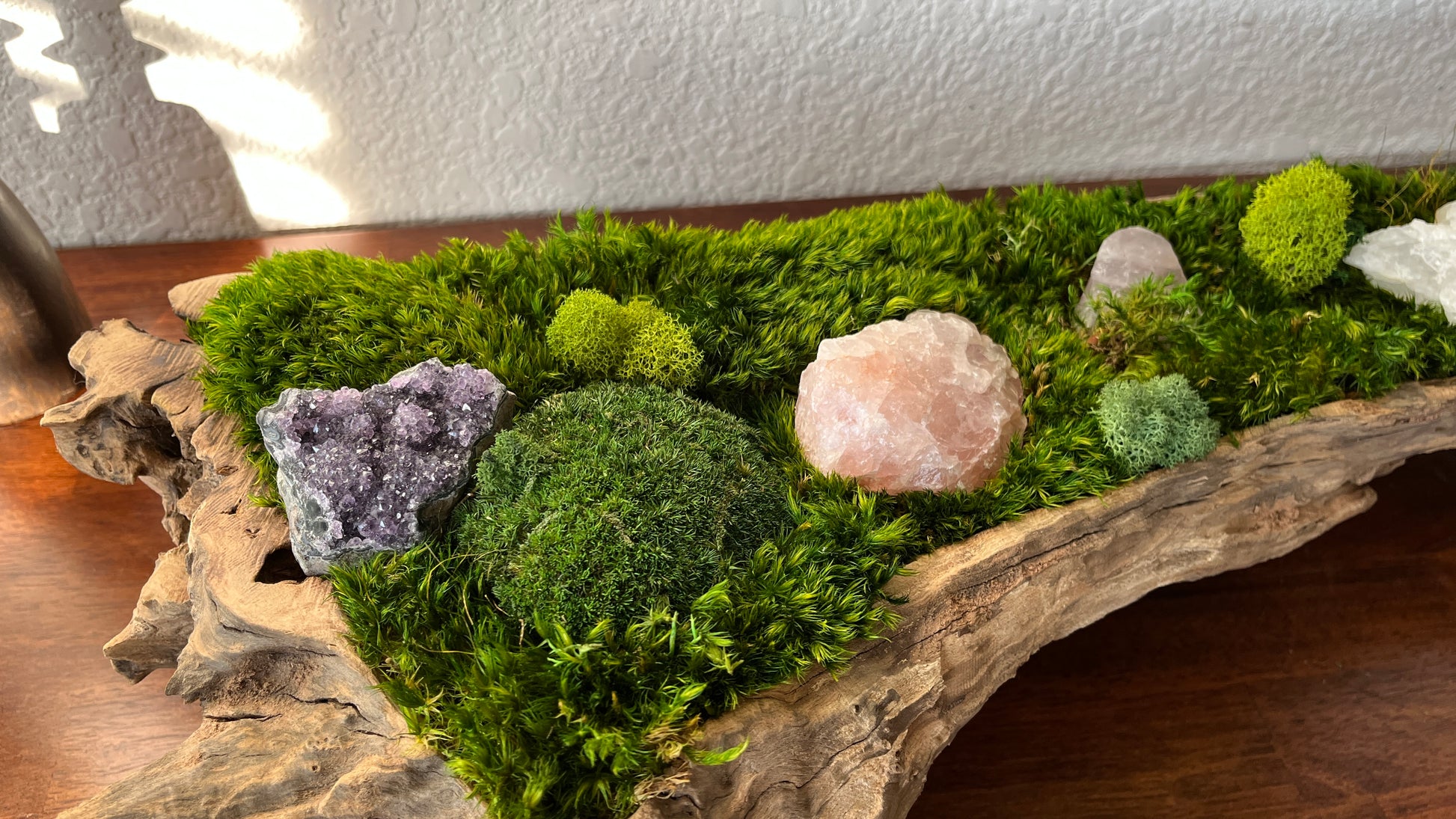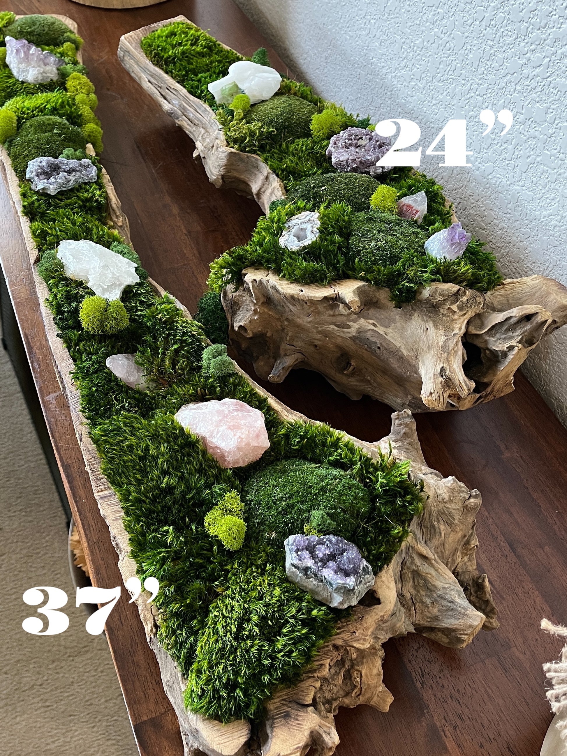 - Handcrafted centerpiece featuring preserved moss, driftwood, and your choice of crystals