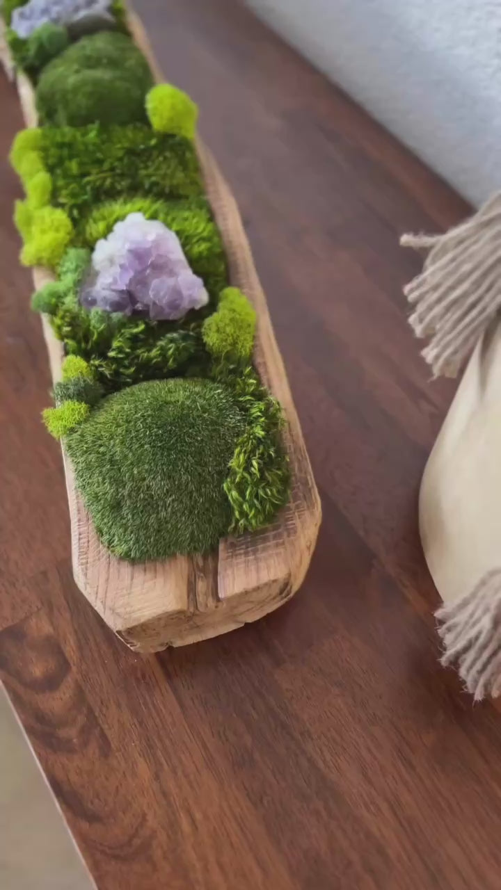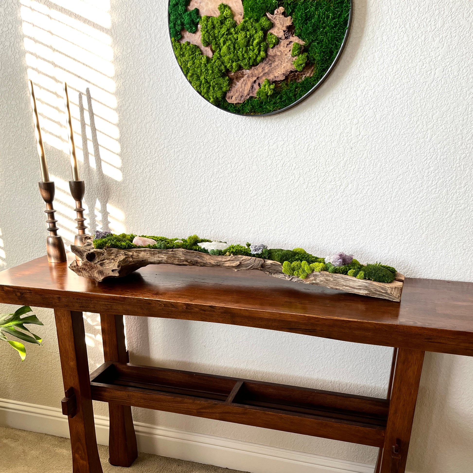 This crystal table centerpiece is a beautiful piece of natural home decor, perfect for adding a touch of boho decor to any room. Featuring a preserved moss arrangement and driftwood crystal display, it can also serve as a meditation altar or zen desk decor.