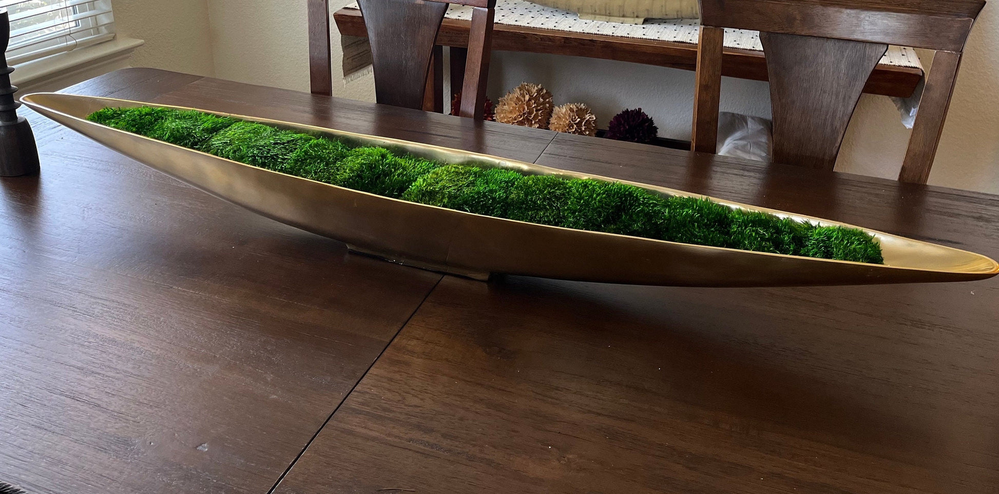 Elevate your dining table with our extra long 52โ moss bowl centerpiece, elegantly presented in a gold metal boat, making it a sophisticated table top planter and a perfect modern luxe home decor addition. This unique arrangement serves as an ideal gift for housewarmings, blending style and nature seamlessly