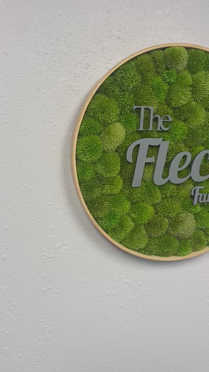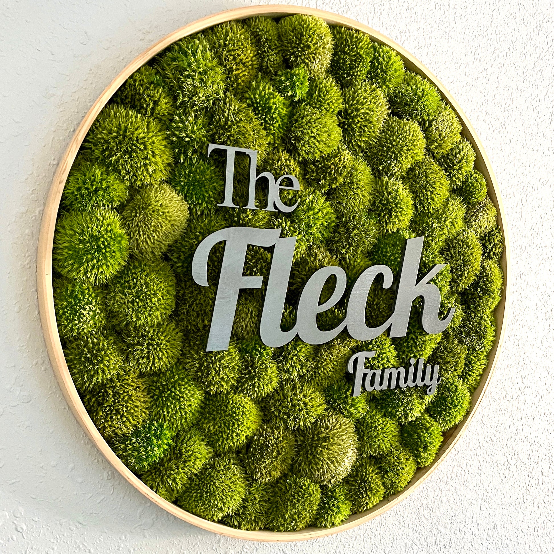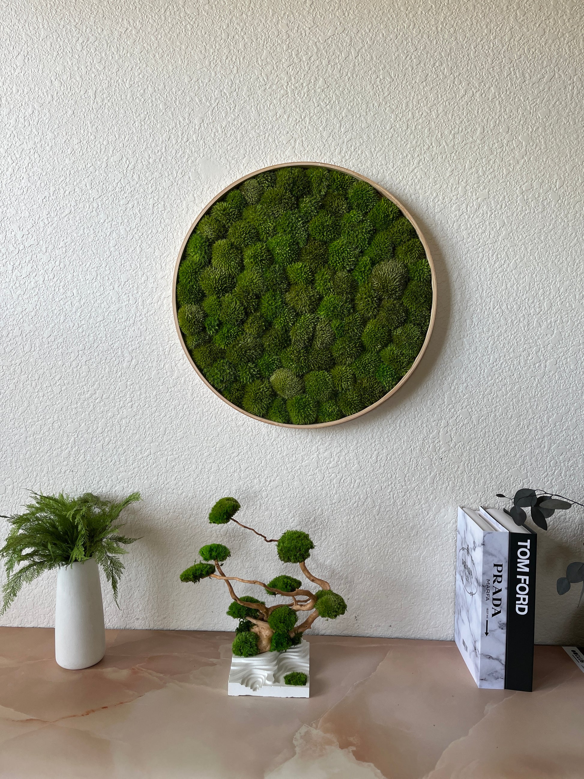 Elevate your space with this handcrafted round moss wall art, featuring premium preserved botanicals that maintain their vibrant green appearance indefinitely without watering or maintenance. The solid wood frame comes in Dark Wood or Light Wood finishes, available in three sizes: 12", 24", or 36" diameter, with custom sizing upon request. Personalize your piece with laser-cut customization—add your name, logo, or business branding in your choice of font and color, making it ideal for corporate offices, retail spaces, or residential interiors. Since preserved moss requires no sunlight or special care, it's a sophisticated, low-maintenance solution for bringing natural biophilic design into any environment. Perfect for business openings, office warmings, or as a distinctive gift for design-conscious recipients.