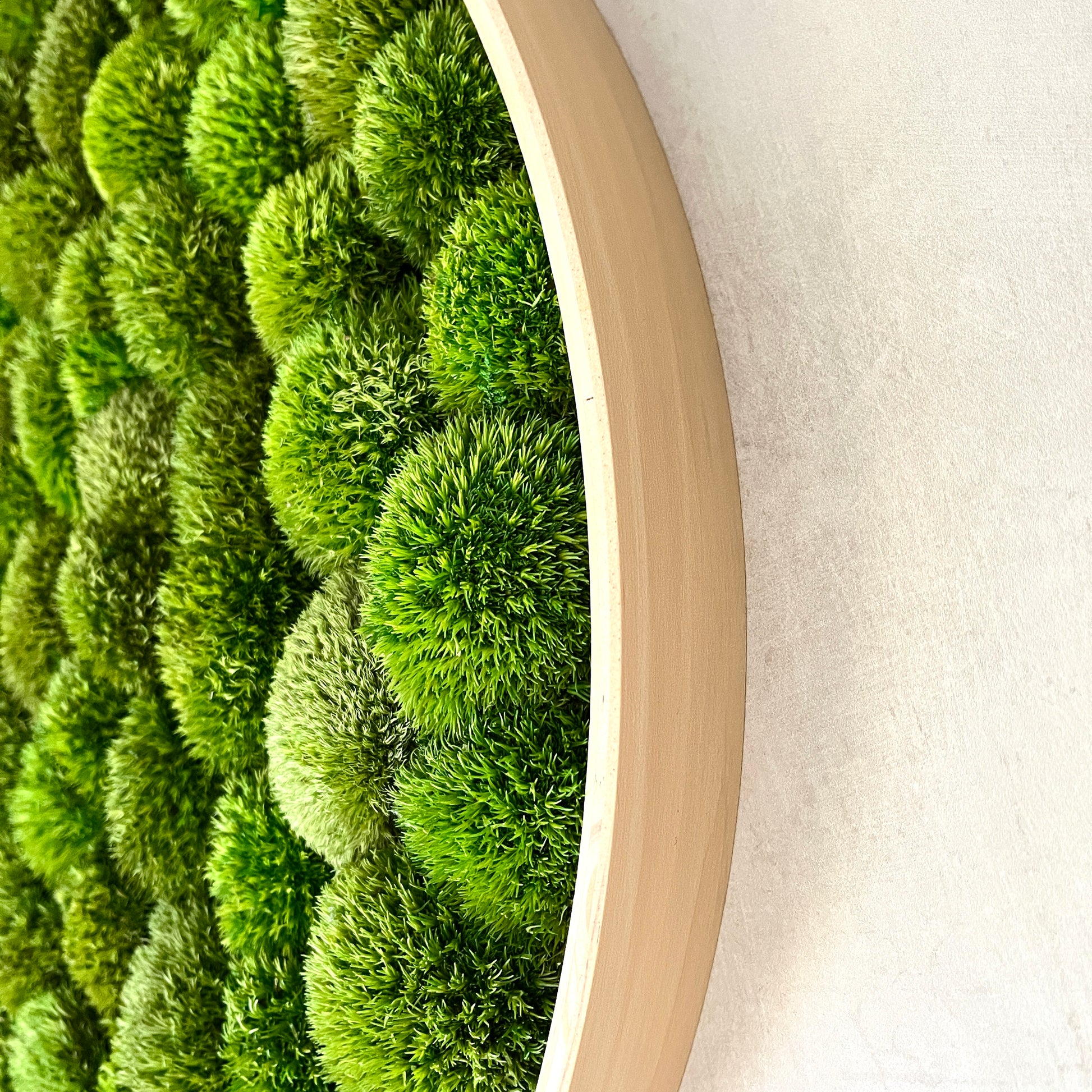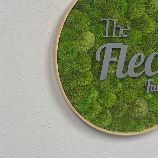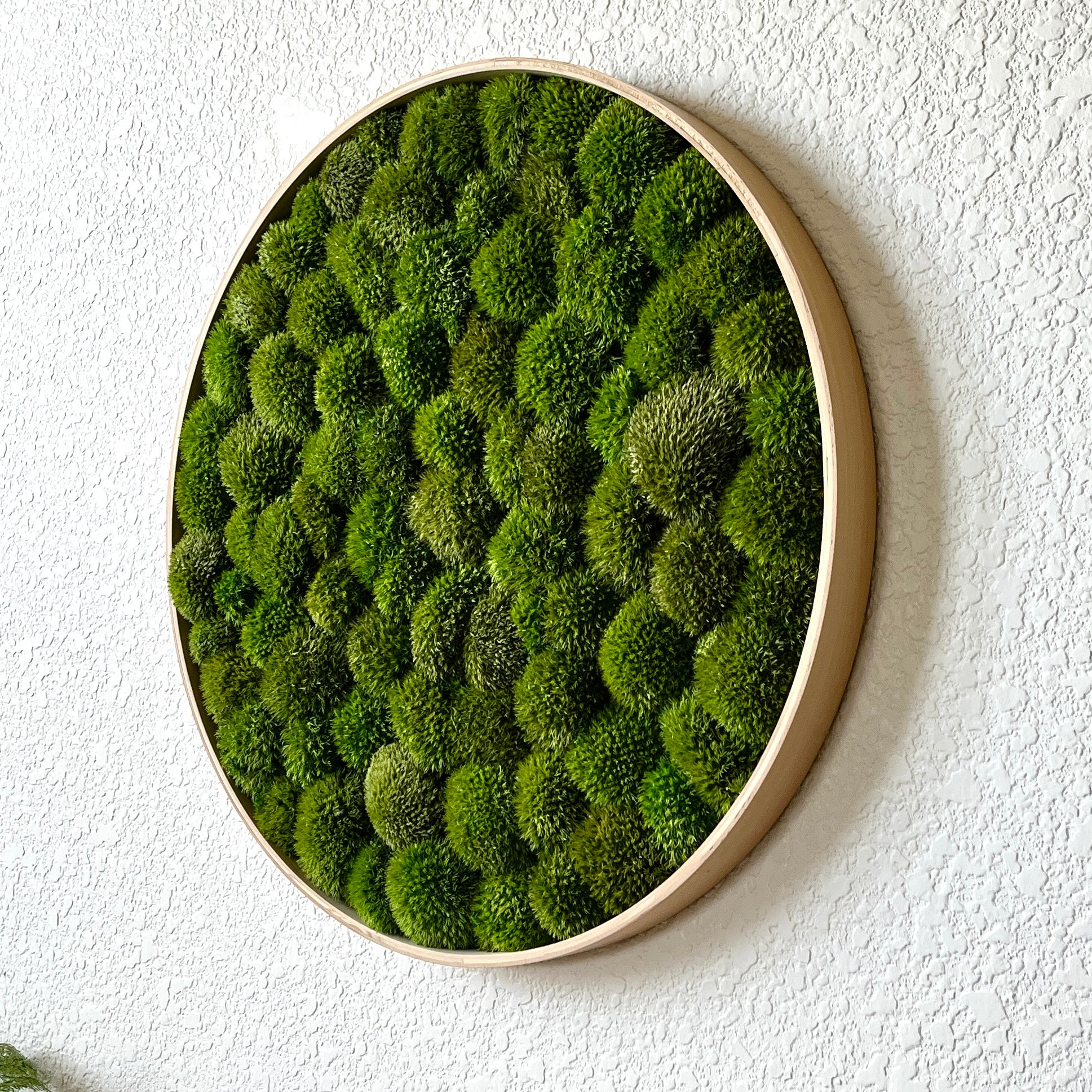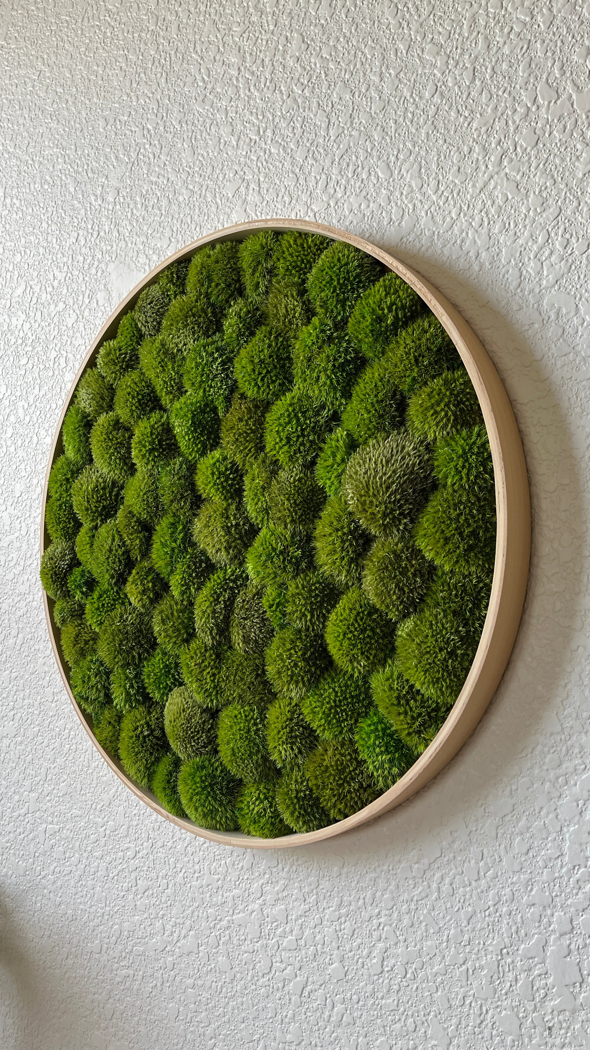 Elevate your space with this handcrafted round moss wall art, featuring premium preserved botanicals that maintain their vibrant green appearance indefinitely without watering or maintenance. The solid wood frame comes in Dark Wood or Light Wood finishes, available in three sizes: 12", 24", or 36" diameter, with custom sizing upon request. Personalize your piece with laser-cut customization—add your name, logo, or business branding in your choice of font and color, making it ideal for corporate offices, retail spaces, or residential interiors. Since preserved moss requires no sunlight or special care, it's a sophisticated, low-maintenance solution for bringing natural biophilic design into any environment. Perfect for business openings, office warmings, or as a distinctive gift for design-conscious recipients.